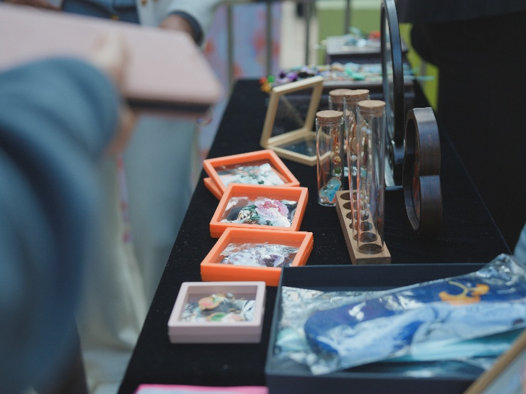 活动当天,纺大非遗社团的同学们带来了精美的非遗手工作品展示,其中缠花和汉绣作品尤为引人注目,梅花葫芦和黄鹤楼等双面绣摆件不仅展示了汉绣的高超技艺,还巧妙地融入了地域文化特色,让观众在欣赏作品的同时,也能感受到武汉这座城市的文化底蕴。而缠花不仅可以用于汉服的装饰,也可以做成胸针、发簪、耳环等饰品,让传统与现代相得益彰。这些作品独一无二,吸引了众多女性观众的眼球,争相试戴购买。