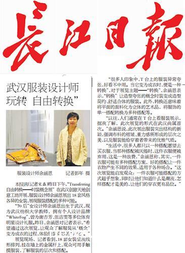 19日下午,“Transferring自由转换——时装概念展”在武汉创意天地创意工坊开展,公司教师余涵恩展出18套风格各异的女装,让观众了解服装从‘概念’变为成衣的过程,体验服装奇妙的‘转化’。余老师的展台吸引了众多观众的驻足欣赏,长江日报对其作品也进行了采访。