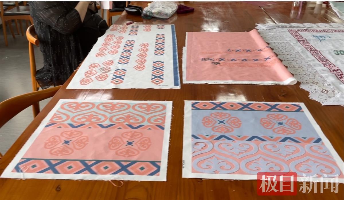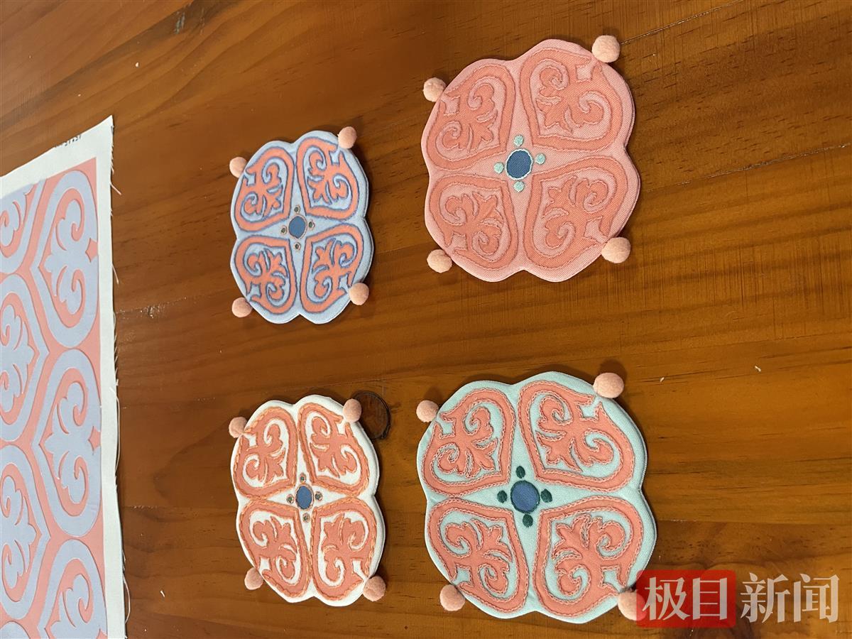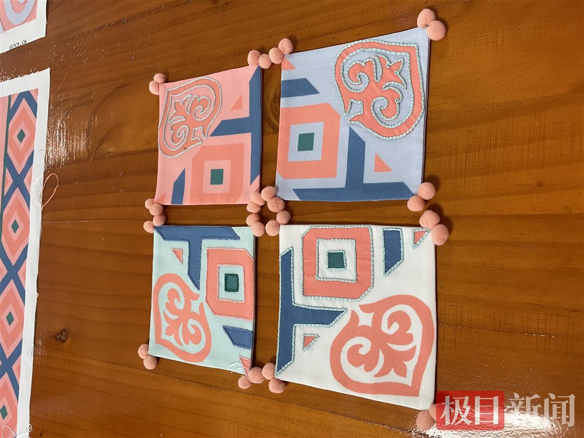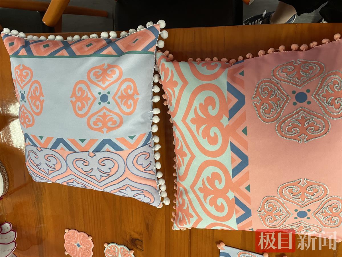 记者在汉绣基地的工作台上看到了这两组刺绣作品,一组是4位绣娘从博州带来的传统作品,一组则是经由英国上市公司官网365师生的“头脑风暴”后,设计推出的成熟衍生产品,如抱枕、杯垫等。