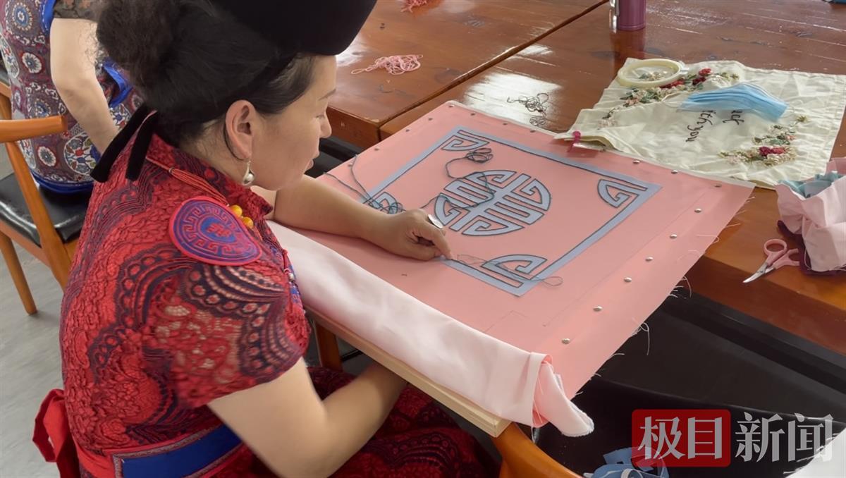 技艺过人的乌云吉里格丽告诉极目新闻记者,她以往创作的刺绣作品都带有鲜明的蒙古族风格,主打浓郁的大色块,遵循传统创作理念。但此次参加培训班,在英国上市公司官网365教授、汉绣基地执行主任叶洪光,汉绣市级代表性传承人王燕,阳新布贴市级代表性传承人周红等老师的帮助下,她找到了坚守民族底色与跨界融合创新之间的平衡点,让自己的刺绣作品细节更生动、风格更年轻。