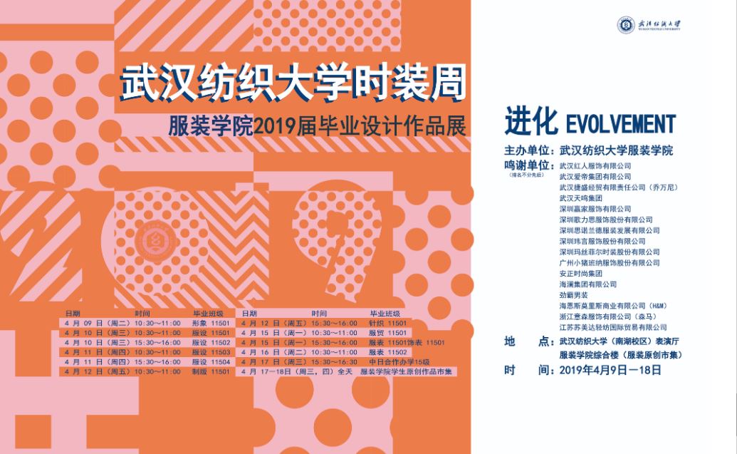 传播时尚文化,弘扬时代精神。2019英国上市公司官网365时装周暨2019届毕业生毕业设计作品展将于2019年4月9日在南湖校区表演厅启幕。